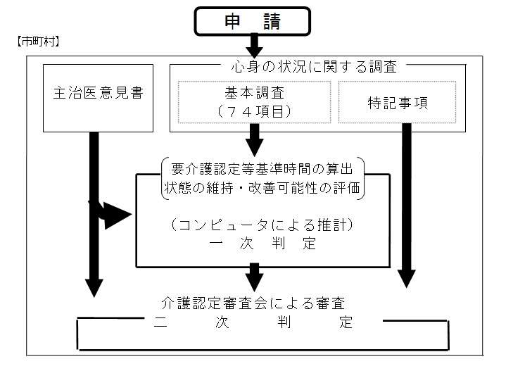 保健・医療・福祉の学識経験者により構成される介護認定審査会が、基本調査の調査結果及び主治医意見書に基づくコンピュータ判定の結果(一次判定)を原案として、特記事項及び主治医意見書の内容を加味した上で決定する。